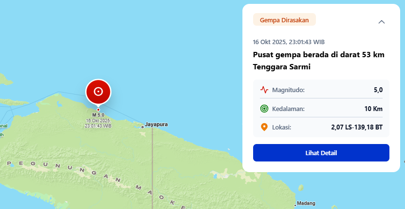 PAPUA.DISWAY.ID - Gempa bumi berkekuatan Magnitudo 5,0 mengguncang wilayah Sarmi, Papua, pada Kamis (16/10/2025) malam.